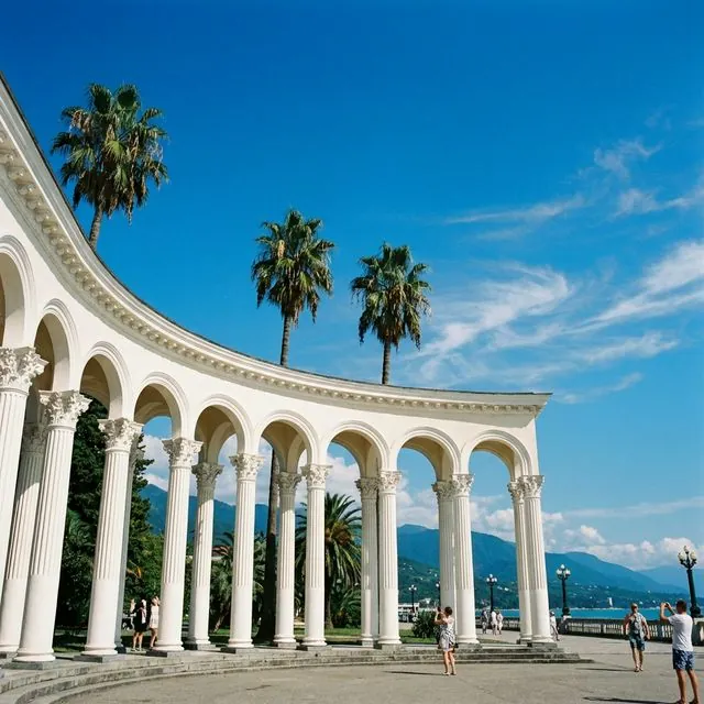 Знаменитые колоннада и ресторан "Гагрипш" — символы Гагры, где можно попробовать абхазскую кухню.