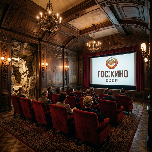 Подземный кинотеатр дачи — экран «ГОСКИНО СССР», бархатные кресла и каменная порода на стенах