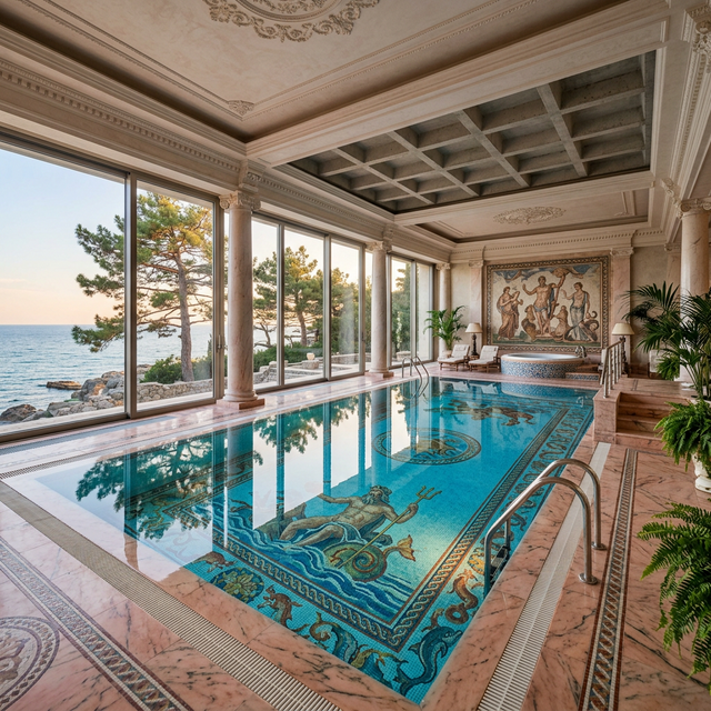 Бассейн с мозаикой на тему древнегреческих мифов и панорамными раздвижными окнами на Чёрное море