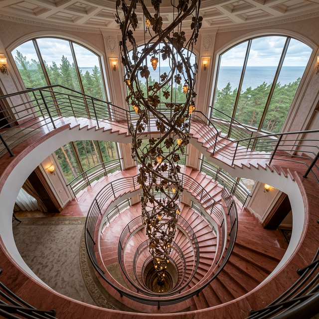 Он создал потрясающие витражи, но главное его творение на даче — это циклопическая бронзовая люстра ручной работы. Она выполнена в форме переплетённой виноградной лозы и пронзает здание насквозь, свисая в лестничный пролёт на невероятные 23 метра. Розовый мрамор на ступенях, кованые элементы и эта исполинская люстра создают ощущение, что ты находишься не в доме отдыха партийного лидера, а в декорациях к фильму о восточных шейхах.