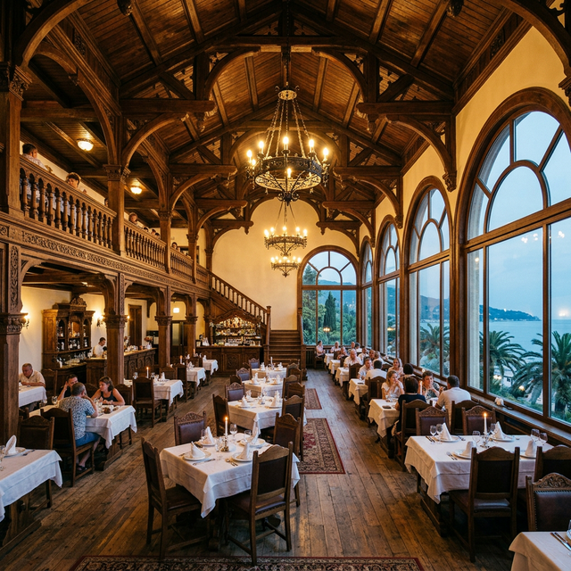 «Гагрипш» — один из самых статусных и атмосферных ресторанов Абхазии. Сюда идут не за бюджетным перекусом, а за эстетикой начала XX века. Интерьер поражает: высоченные потолки, огромные панорамные окна с видом на море, резные балконы и массивная деревянная мебель.