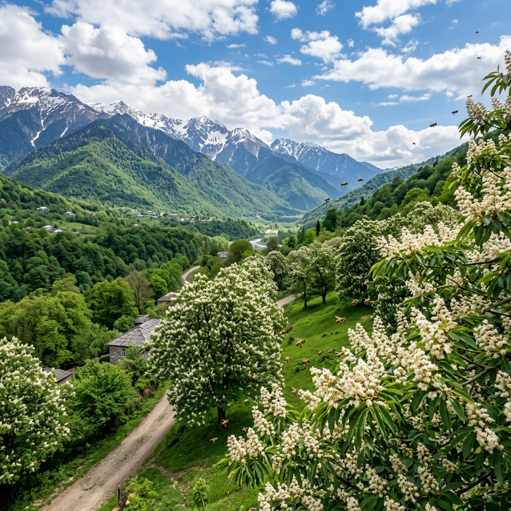 Самый ценный — каштановый мёд, собранный во время короткого периода цветения каштанов (всего 2–3 недели в июне). Каштан съедобный растёт на высоте 200–800 метров, и абхазские пчёлы собирают нектар в экологически чистых горных лесах без единого химического удобрения.