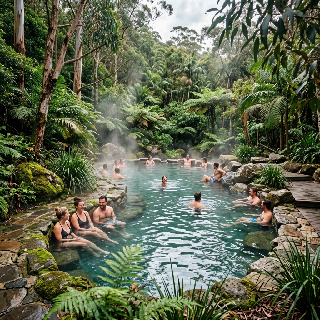 Оптимальное время! На улице +10°C, а вы лежите парном бассейне (40°C), вокруг стелется туман с эвкалиптовых деревьев. Людей мало, атмосфера релакса 100%.