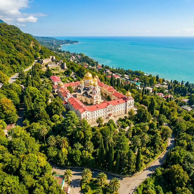 Монастырь пережил войны и запустение, но сегодня полностью восстановлен и действует. Золотые купола видны с моря за несколько километров — это главная «визитная карточка» не только Нового Афона, но и всей Абхазии. Вход свободный, но рекомендуется уважительный дресс-код: закрытые плечи и колени.
