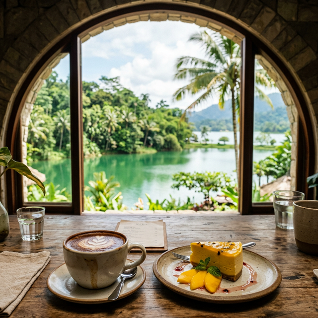 Панорама 360 градусов — благодаря круглой планировке здания с панорамными арками, из-за каждого столика открывается завораживающий вид на озеро и густые тропические леса ущелья реки Псырцха.