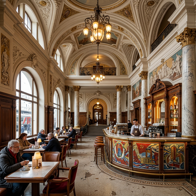 Уникальная барная стойка — она отделана мозаикой, рисунок которой в точности повторяет орнамент на полу станции, создавая единый эстетический ансамбль.
