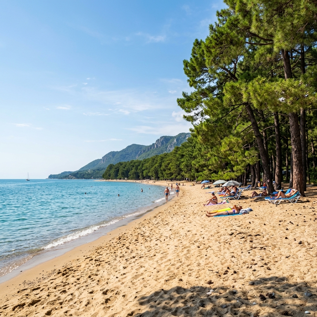 Главная фишка: Огромные реликтовые пицундские сосны, которые растут прямо из мягкого желтого песка, создавая густую естественную тень от палящего солнца.