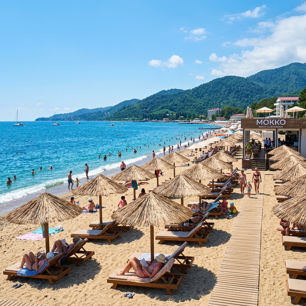 Мокко (Mokko Beach) — возможно, самый красивый и современный «платный» песчаный пляж в Сухуме. Это эталон того, как должен выглядеть европейский цивилизованный пляжный отдых в Абхазии 2026.