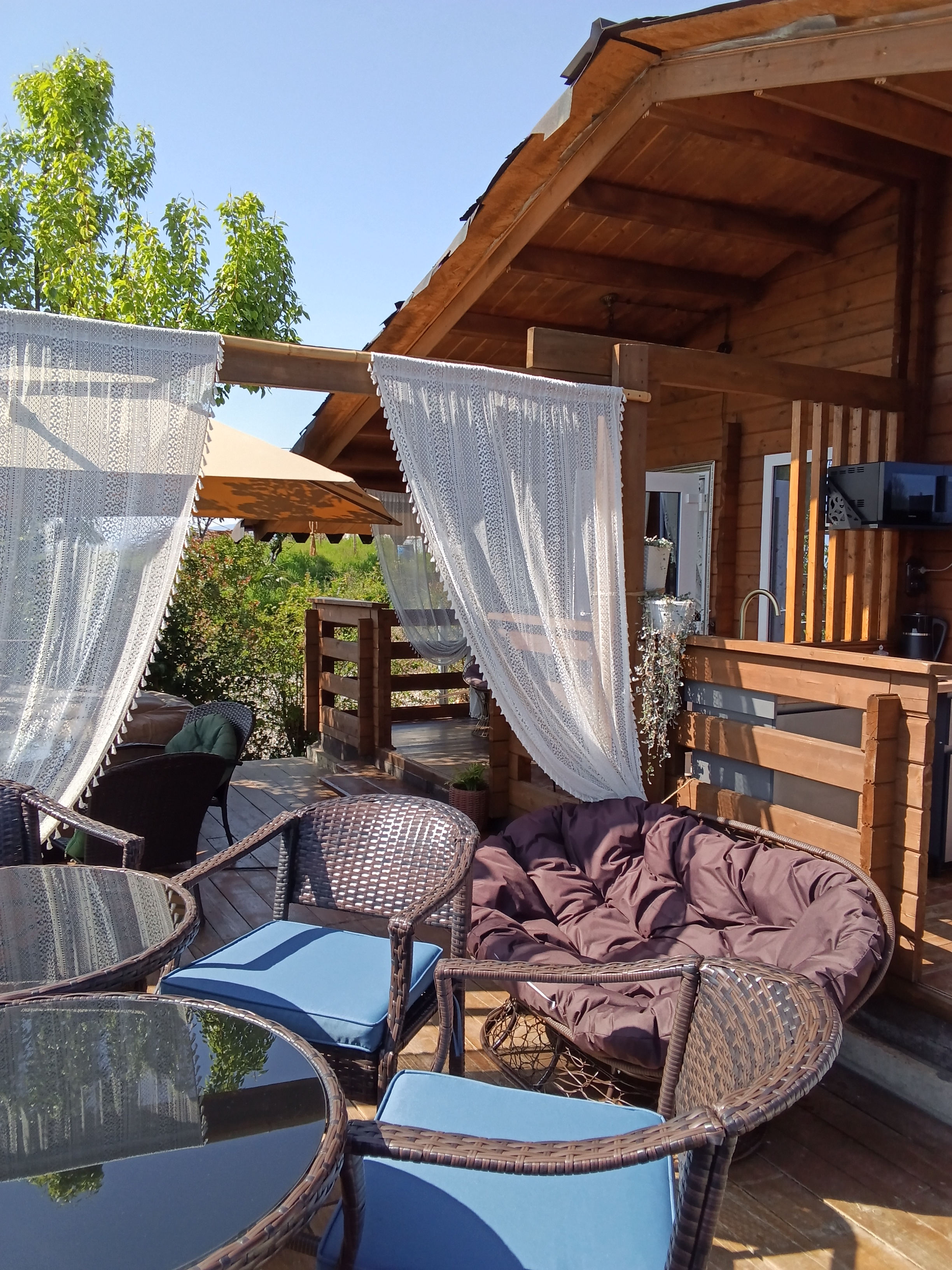 Два деревянных домика под одной крышей с одной большой террасой с видом на море.Полностью приватная обстановка.Отдых для тех кто ценит личное пространство.